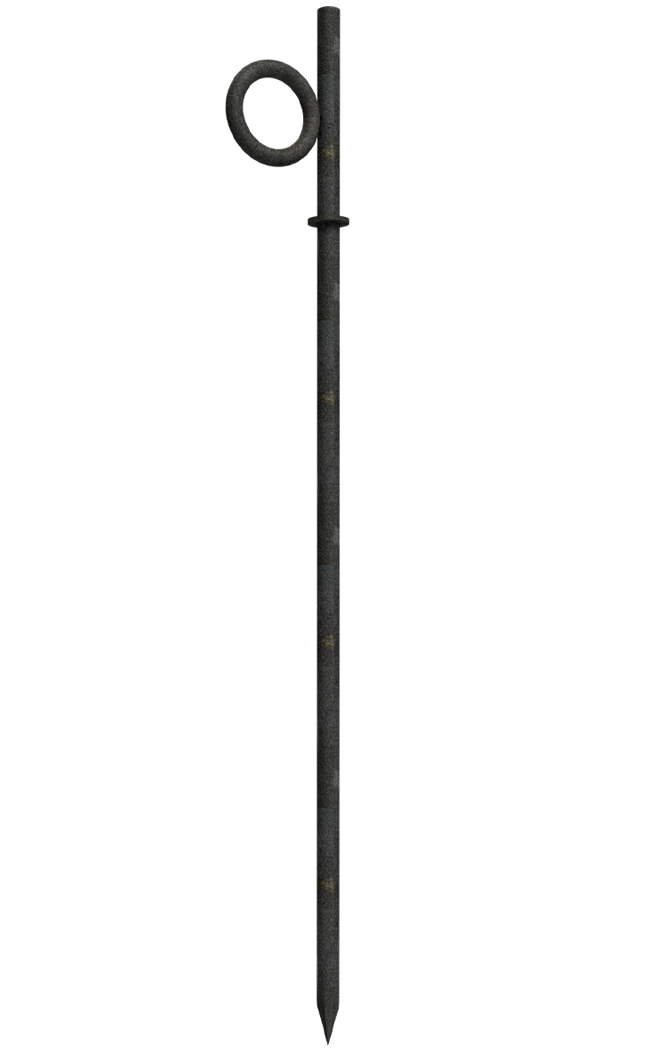 Stacheldraht- Erdnagel aus Rundeisen Ø 14 mm gefertigt, mit angeschweißter Ringöse Ø 74mm außen, Ø 5